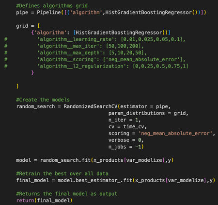 - Situation: a big retail company with two stores and 10 products by stored needed to predict sales for the next 8 days at store-product level.- Task: a 3-year historic SQL database was provided and needed to be cleaned, analyzed, preprocessed and used for making the forecast prediction for this window.- Action: the process was wrapped on several functions using Python Pandas and Sklearn with the goal to build the final datamart for prediction through different processes such as data wrangling, data quality, EDA, variable creating (assessing the Intermittent demand), feature transformation (using OneHot and Target Encoding), variable preselection (using Mutual Information) and later training (using TimeSeriesSplit for cross validation and Random Search), evaluating (on a Validation dataset) and finally executing the HistGradientBoost Regression model to predict the 8 days window prediction.- Results: after testing the correct functioning of the model we relied on MAE (5.45), it was decided to carry on with execution which showed the model successfully predicted the sales for the 8-days window thanks to the recursive forecast function.